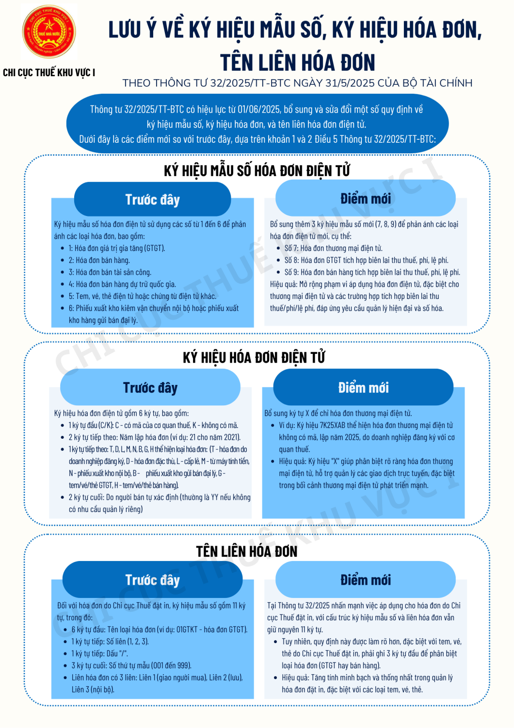 Ngày 31/5/2025, Bộ Tài chính ban hành Thông tư số 32/2025/TT-BTC, trong đó Điều 5 quy định rõ các nội dung liên quan đến ký hiệu mẫu số, ký hiệu hóa đơn, tên liên hóa đơn, áp dụng cho cả hóa đơn điện tử và hóa đơn do cơ quan thuế đặt in. Lưu ý cập nhật Ký hiệu mẫu số hóa đơn hàng năm từ ngày 01/06/2025, Thông tư số 32/2025/TT-BTC chính thức có hiệu lực, quy định nhiều điểm mới quan trọng liên quan đến: