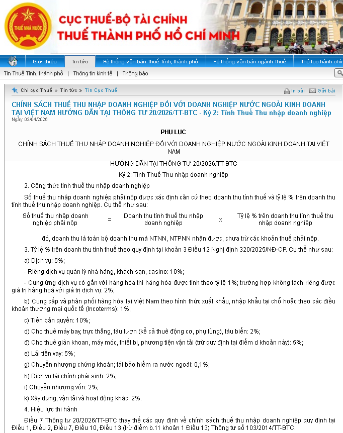 Quy định cũ (Thông tư 103/2014/TT-BTC): Doanh thu tính thuế TNDN là doanh thu chưa bao gồm thuế GTGT. Do đó, quy trình “Gross-up” hai bước riêng biệt phải quy đổi TNDN trước, sau đó lấy kết quả đó quy đổi tiếp GTGT. Quy định mới (Thông tư 20/2026/TT-BTC): Doanh thu tính thuế TNDN là toàn bộ doanh thu nhà thầu nhận được, trước khi trừ bất kỳ khoản thuế nào. Như vậy, thuế TNDN và thuế GTGT hiện nay sẽ được tính trên cùng một cơ sở doanh thu.