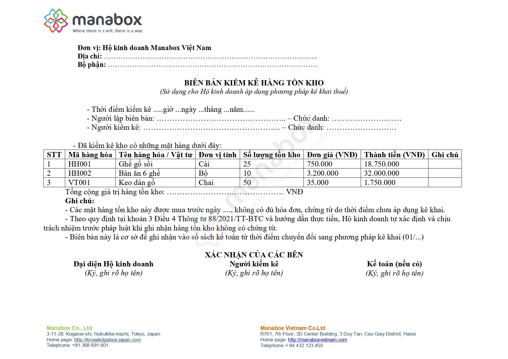 Bài viết cung cấp Mẫu biên bản kiểm kê của Hộ kinh doanh, là cơ sở để ghi nhận vào sổ sách kế toán từ thời điểm chuyển đổi sang phương pháp kê khai do các mặt hàng tồn kho này được mua trước ngày chuyển đổi, không có đủ hóa đơn, chứng từ do thời điểm chưa áp dụng kê khai. Theo quy định tại khoản 3 Điều 4 Thông tư 88/2021/TT-BTC và hướng dẫn thực tiễn, Hộ kinh doanh tự xác định và chịu trách nhiệm trước pháp luật khi ghi nhận hàng tồn kho không có chứng từ.