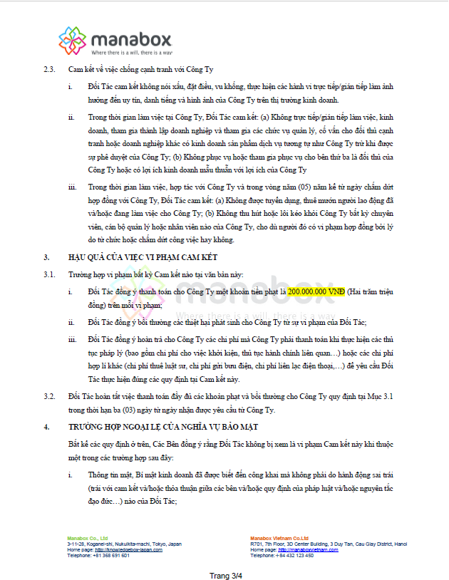 Cam Kết Bảo Mật Thông Tin Và Chống Cạnh Tranh (Sau đây gọi là “Cam kết”) này được lập và có hiệu lực vào ngày __ tháng __ năm 20____ bởi cá nhân có thông tin nêu tại phần ký của Cam kết (Sau đây gọi tắt là “Đối Tác”) và CÔNG TY TNHH MANABOX VIỆT NAM ; Mã số thuế: 0106785090; Địa chỉ: Phòng 701, tầng 7,tòa nhà 3D center số 3 Duy Tân, phường Dịch Vọng Hậu, quận Cầu Giấy, thành phố Hà Nội, Việt Nam; Đại diện bởi: Ông SUGENO TOMOHIRO (Sau đây gọi tắt là “Công Ty”)
