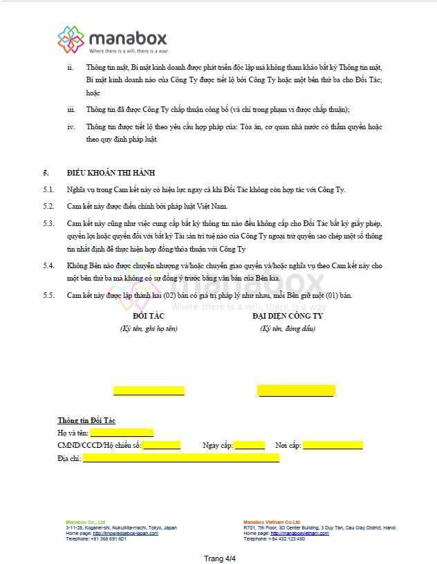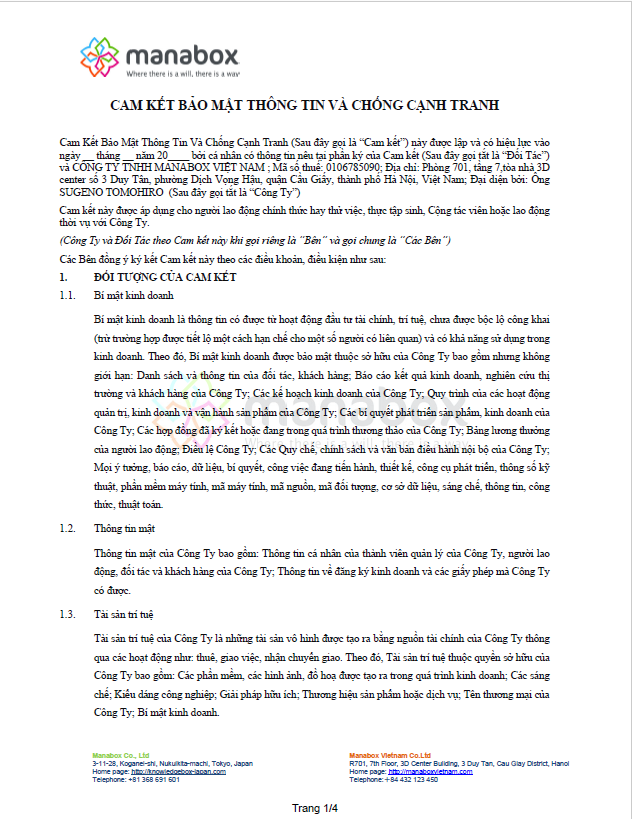 Cam Kết Bảo Mật Thông Tin Và Chống Cạnh Tranh (Sau đây gọi là “Cam kết”) này được lập và có hiệu lực vào ngày __ tháng __ năm 20____ bởi cá nhân có thông tin nêu tại phần ký của Cam kết (Sau đây gọi tắt là “Đối Tác”) và CÔNG TY TNHH MANABOX VIỆT NAM ; Mã số thuế: 0106785090; Địa chỉ: Phòng 701, tầng 7,tòa nhà 3D center số 3 Duy Tân, phường Dịch Vọng Hậu, quận Cầu Giấy, thành phố Hà Nội, Việt Nam; Đại diện bởi: Ông SUGENO TOMOHIRO (Sau đây gọi tắt là “Công Ty”)