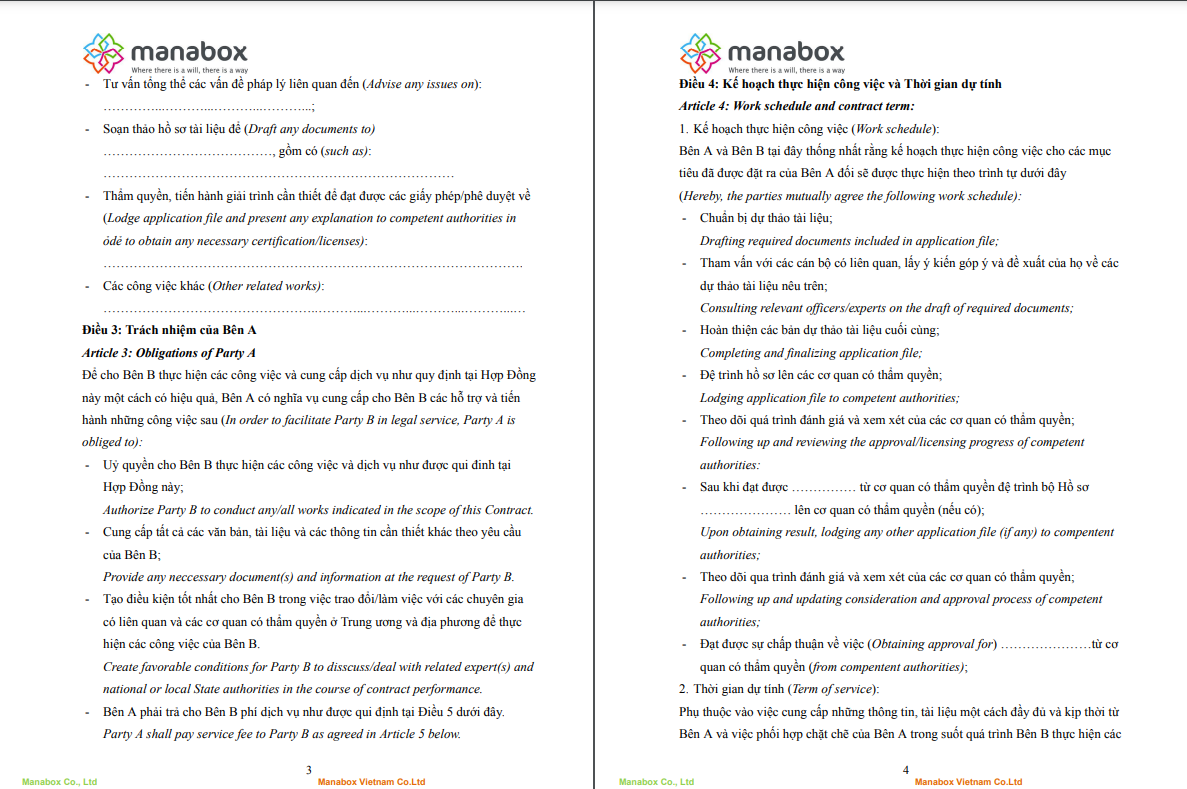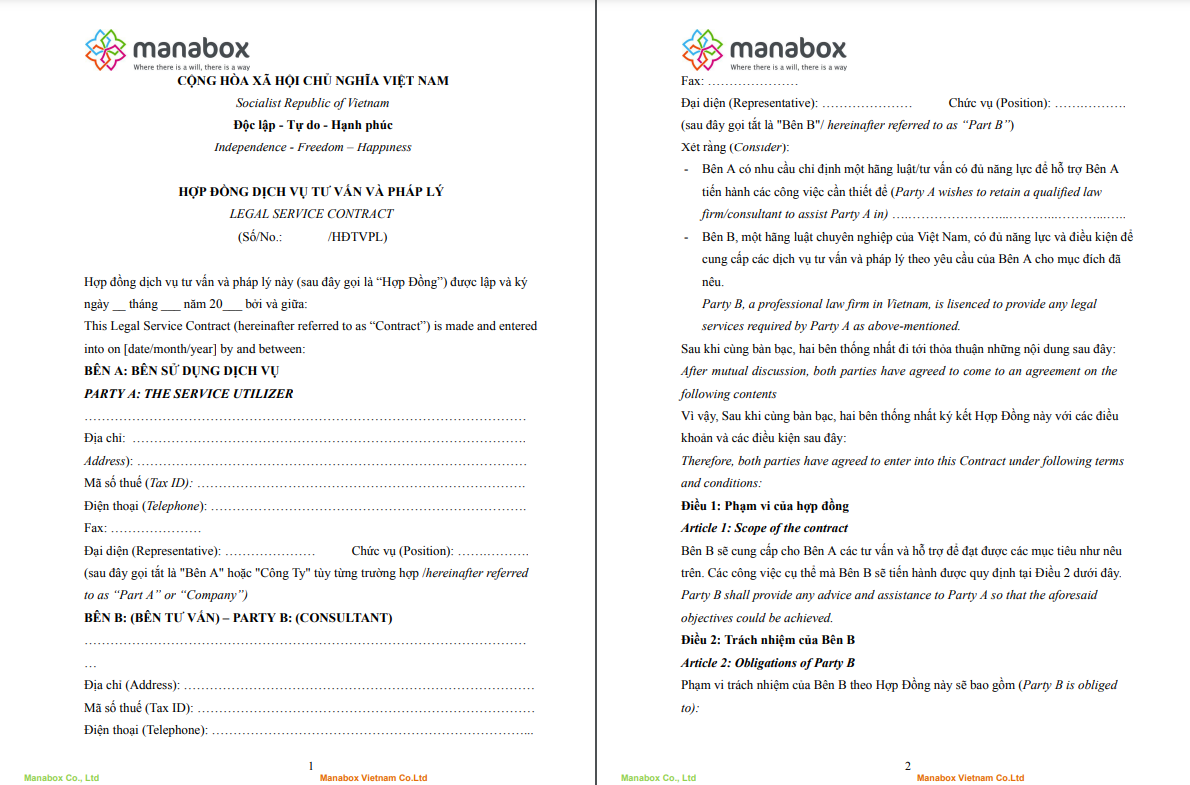 Nhu cầu dịch vụ tư vấn và pháp lí thường xuyên cho tổ chức, cá nhân, doanh nghiệp trong những năm qua không ngừng tăng cao. Để giúp cho việc thỏa thuận trở nên suôn sẻ, mẫu hợp đồng dịch vụ pháp lý là một công cụ quan trọng trong quá trình thực hiện cung ứng dịch vụ giữa các bên. Sau đây Manabox xin cung cấp cho bạn đọc thông tin về hợp đồng dịch tư vấn và pháp lí: