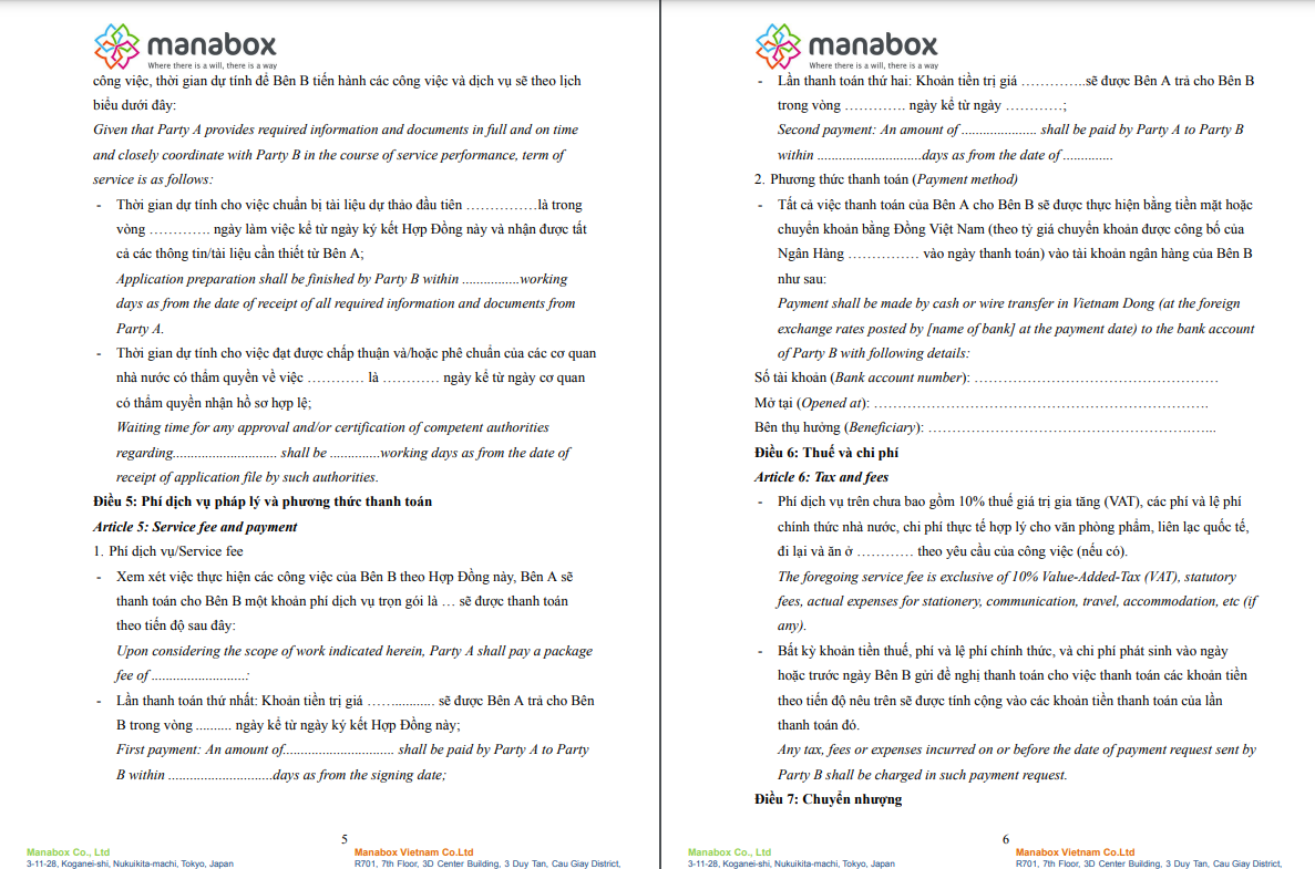 Bên cạnh đó mẫu hợp đồng được tích hợp hai ngôn ngữ Anh-Việt giúp doanh nghiệp nước ngoài dễ dàng tiếp cận với các dịch vụ trong nước đồng thời giảm thiểu rào cản ngôn ngữ giữa hai bên và tránh được rủi ro pháp lí.