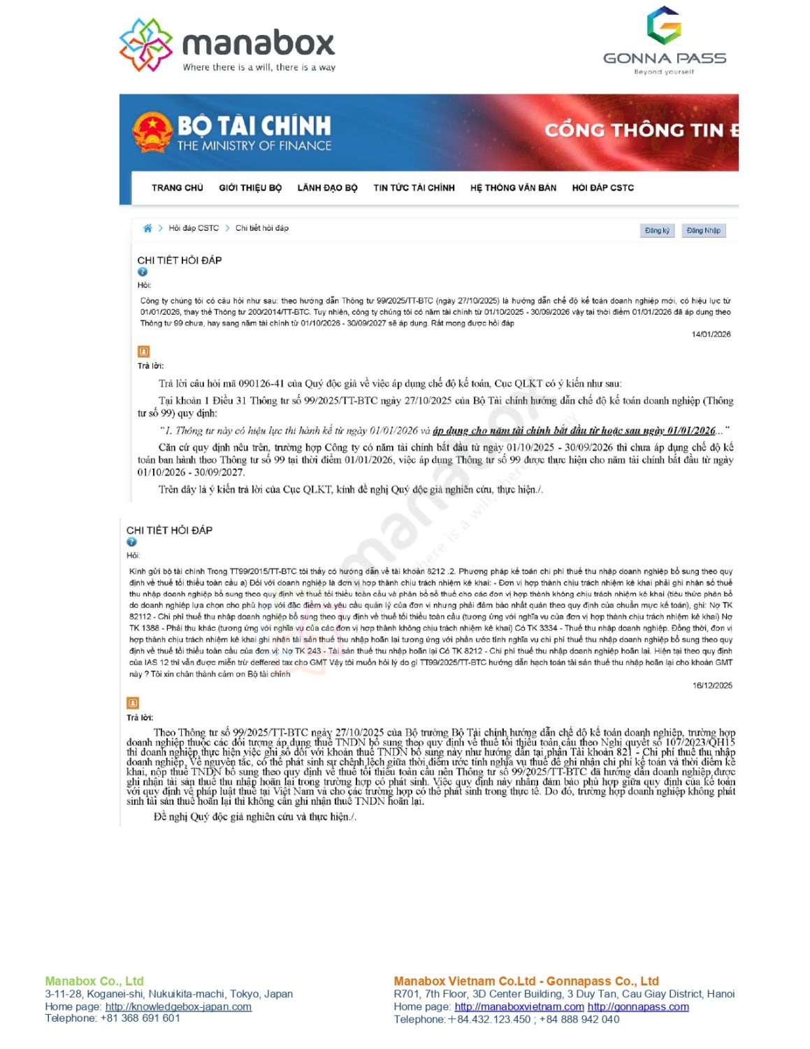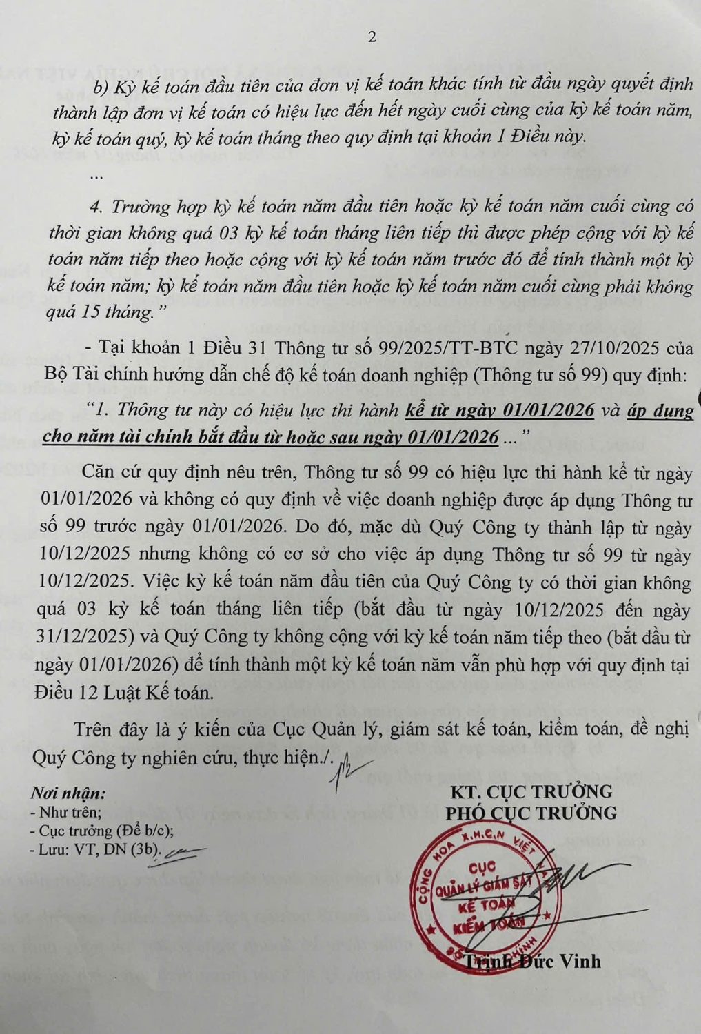 - Nếu doanh nghiệp gộp năm tài chính (Năm tài chính 2026 kéo dài từ 10/12/2025 – 31/12/2026), kỳ kế toán năm đầu tiên (2026) sẽ áp dụng Thông tư 99