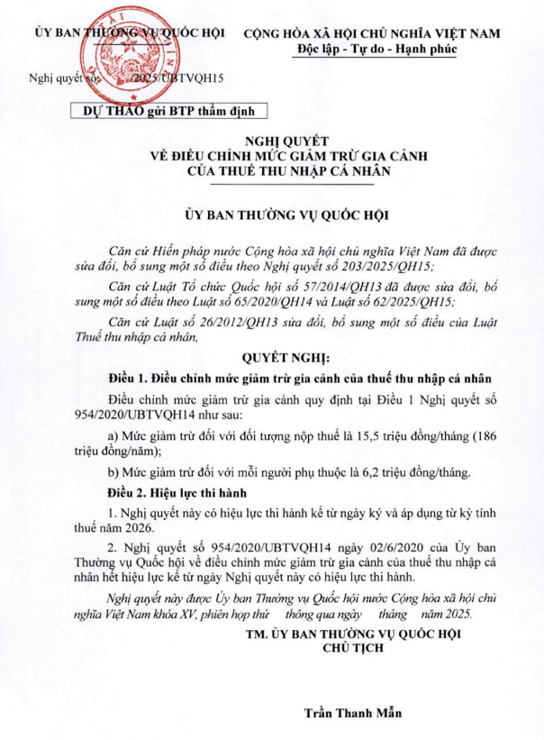 Theo dự thảo Nghị quyết về điều chỉnh mức giảm trừ gia cảnh của thuế thu nhập cá nhân, đề xuất điều chỉnh mức giảm trừ gia cảnh quy định tại Điều 1 Nghị quyết 954/2020/UBTVQH14 như sau: