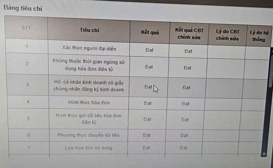 | 4 | Hình thức hóa đơn hợp lệ | Đạt |