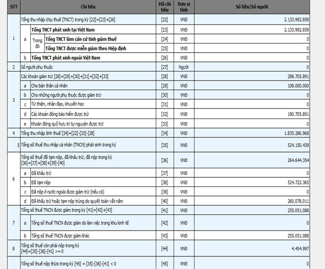 Cá nhân A phát sinh thu nhập chịu thuế là 1.854.206.047 đồng; Các khoản đóng bảo hiểm được trừ là 159.261.944 đồng. Cá nhân A thực hiện kê khai các chỉ tiêu theo hướng dẫn, tính được số thuế phát sinh trong kỳ là 437.230.436 đồng
