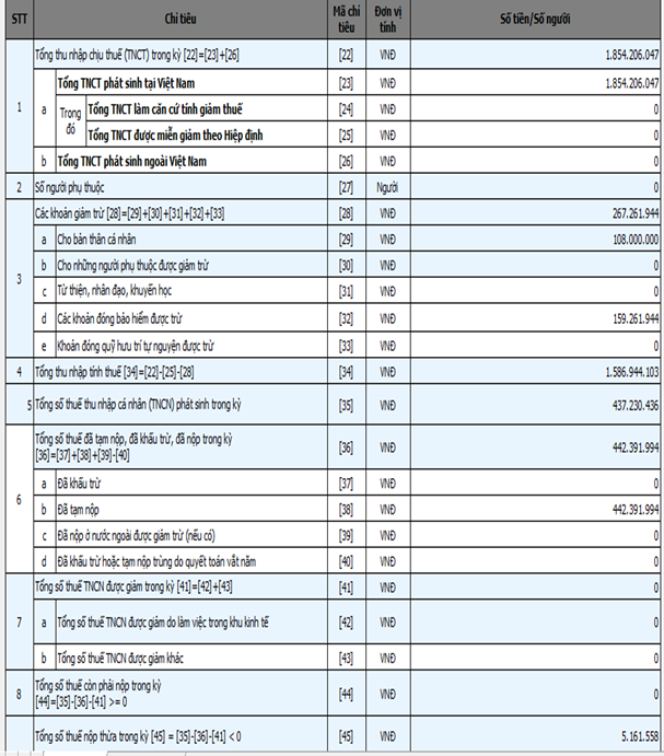 Cá nhân A phát sinh thu nhập chịu thuế là 1.854.206.047 đồng; Các khoản đóng bảo hiểm được trừ là 159.261.944 đồng. Cá nhân A thực hiện kê khai các chỉ tiêu theo hướng dẫn, tính được số thuế phát sinh trong kỳ là 437.230.436 đồng