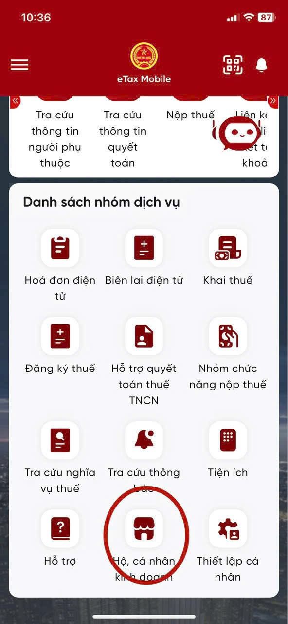 Bước 5: Người nộp thuế chọn Mục Hộ, cá nhân kinh doanh (Vòng tròn màu vàng).