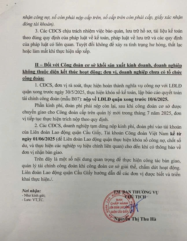 Thực hiện theo hướng dẫn của Liên đoàn Lao động quận Cầu Giấy tại Văn bản số 49/LĐLĐ ngày 29/5/2025 về công tác quản lý tài chính, tài sản công đoàn khi kết thúc hoạt động: