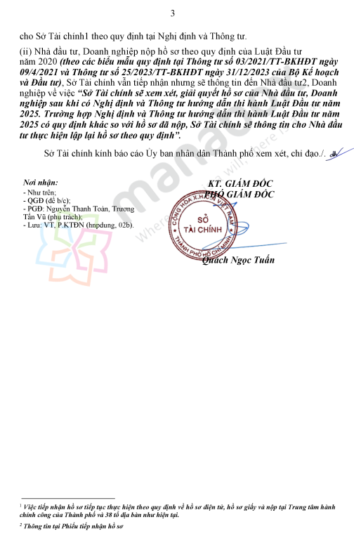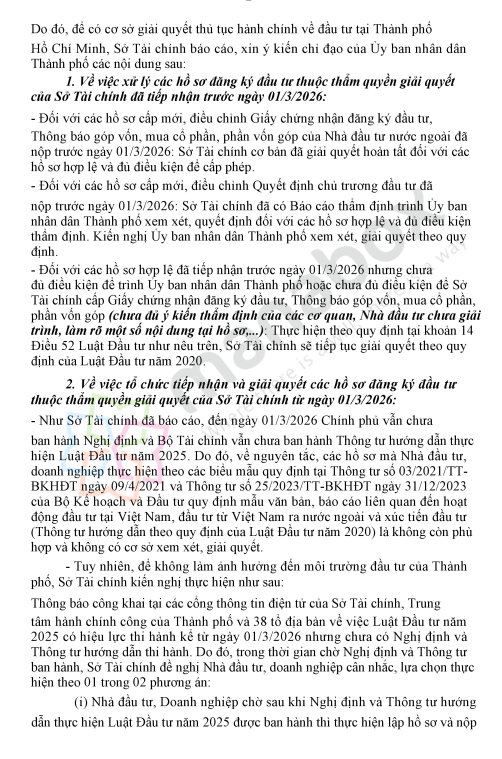 Theo báo cáo của Sở Tài chính TP.HCM về việc triển khai Luật Đầu tư 2025, do Chính phủ và Bộ Tài chính chưa ban hành nghị định và thông tư hướng dẫn, các biểu mẫu hồ sơ theo quy định của Luật Đầu tư 2020 hiện không còn phù hợp để xử lý thủ tục theo luật mới.