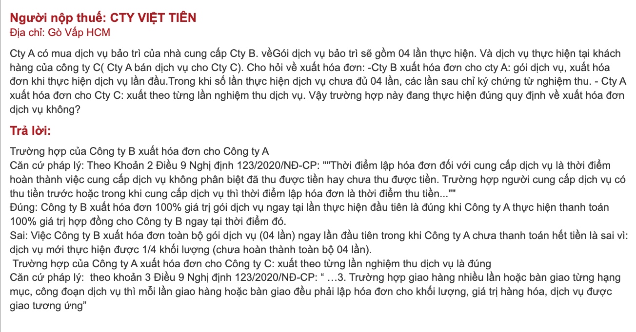 Trường hợp B làm SAI: Nếu Công ty A chưa thanh toán hết tiền, mà B lại xuất hóa đơn cho toàn bộ gói dịch vụ (04 lần) ngay khi mới làm xong lần 1 là SAI quy định. Lý do: Dịch vụ mới thực hiện được 1/4 khối lượng, chưa hoàn thành và chưa thu được tiền thì không có cơ sở để xuất hóa đơn cho phần còn lại.