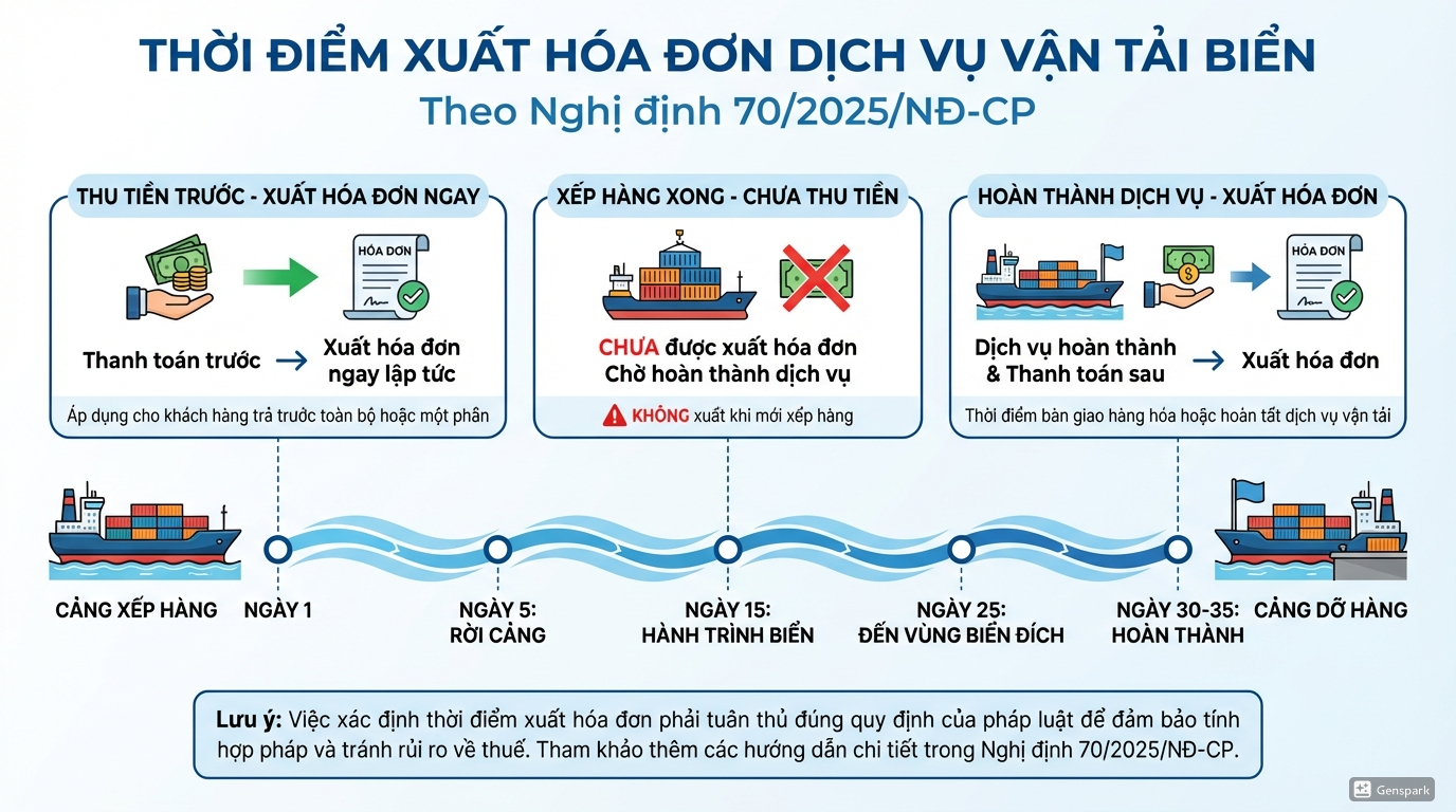 Đối với dịch vụ vận tải đường biển, một chuyến hàng thường kéo dài từ 30-35 ngày qua nhiều cảng khác nhau. Việc xác định thời điểm xuất hóa đơn phụ thuộc chặt chẽ vào hai yếu tố: Thời điểm hoàn thành dịch vụ và Thời điểm thu tiền.