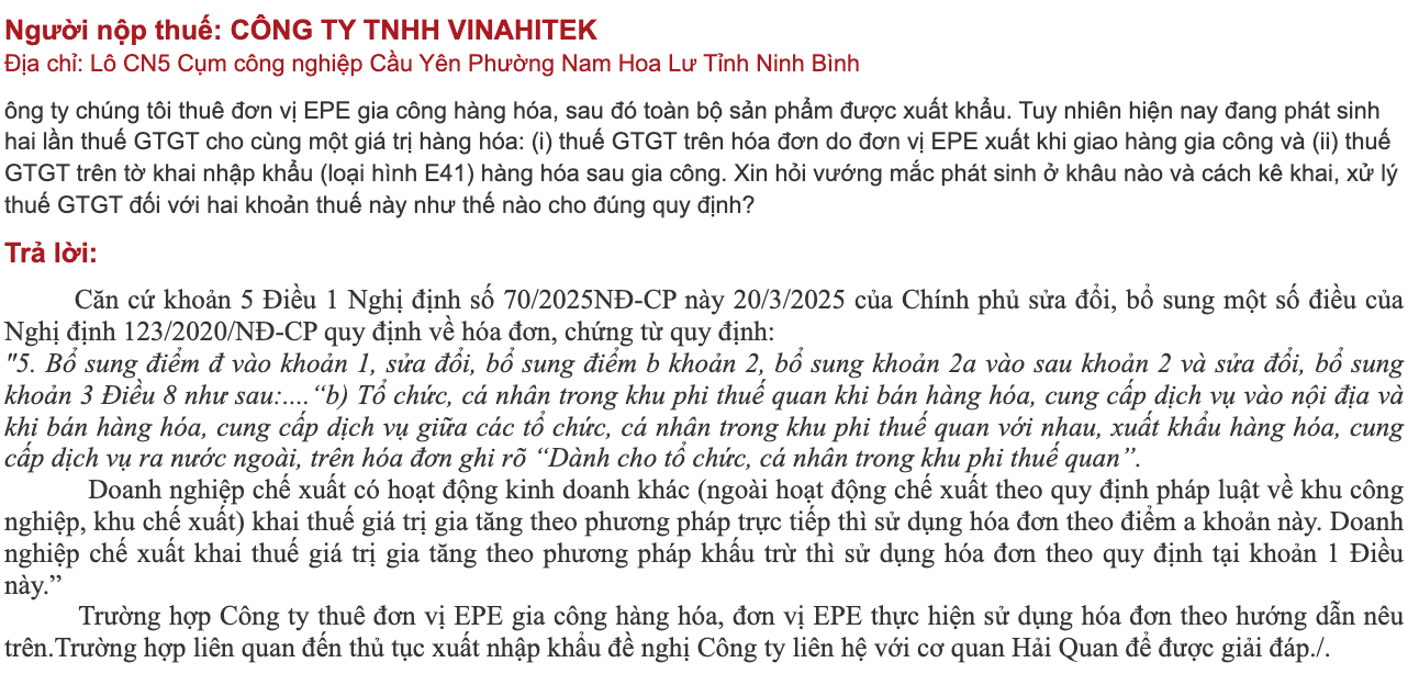Trường hợp của Công ty VINAHITEK phản ánh một thực tế phổ biến khi doanh nghiệp chưa cập nhật quy định về hóa đơn điện tử cho khu phi thuế quan:
