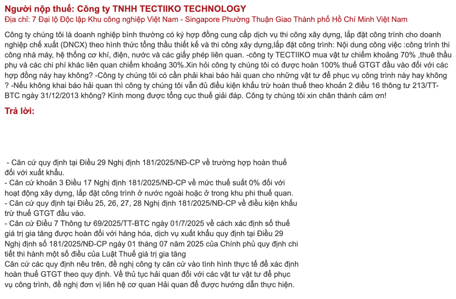 Cơ quan Thuế nhấn mạnh rằng doanh nghiệp cần căn cứ vào tình hình thực tế của các hợp đồng thi công để xác định chính xác điều kiện hoàn thuế. Đặc biệt: