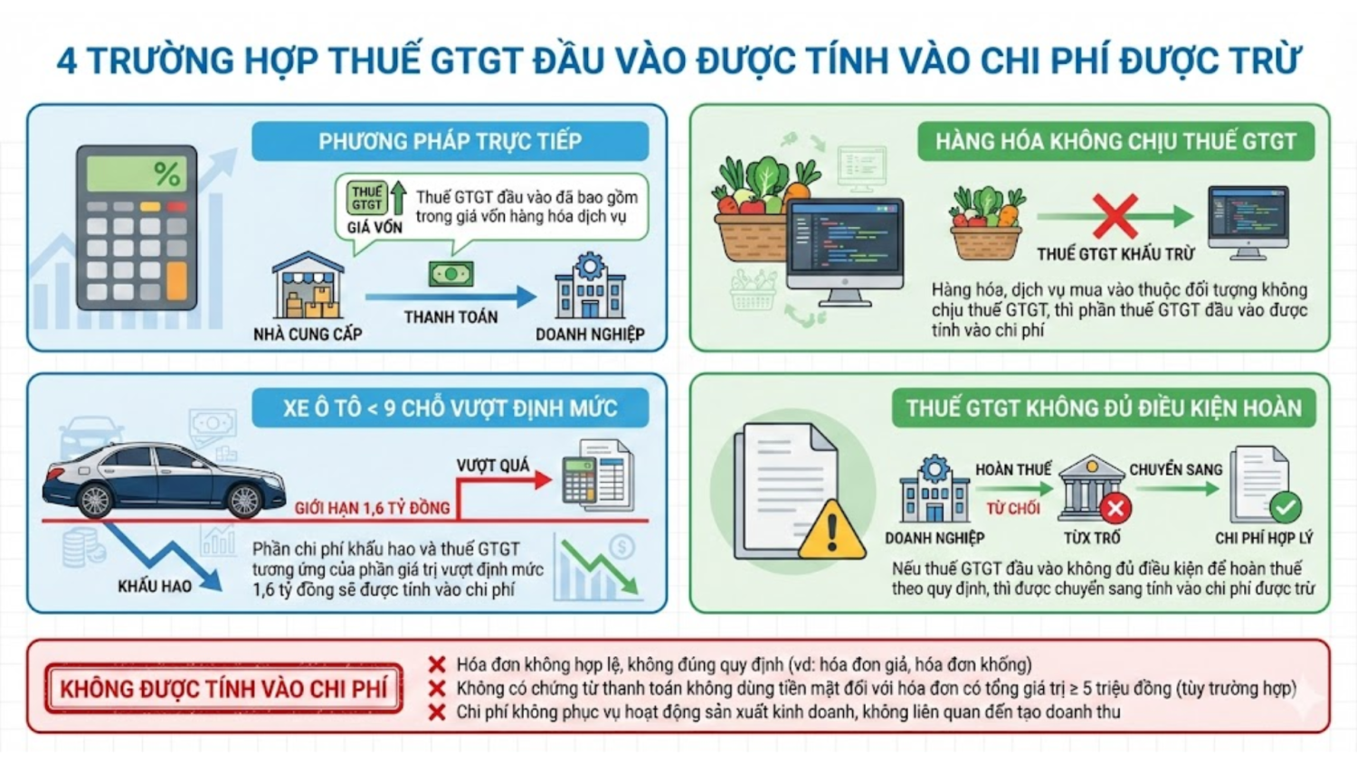 - Các trường hợp Thuế GTGT đầu vào KHÔNG ĐƯỢC tính vào chi phí