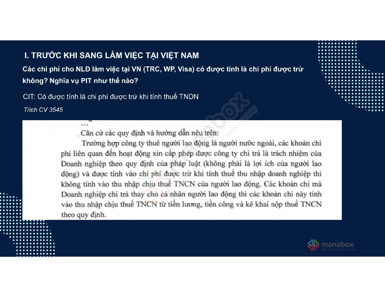 Các chi phí cho người lao động nước ngoài làm việc tại Việt Nam (TRC, WP, Visa) có được tính là chi phí được trừ không? Nghĩa vụ thuế TNCN (PIT) như thế nào? Thuế với chi phí cho lao động nước ngoài làm visa giấy phép lao động
