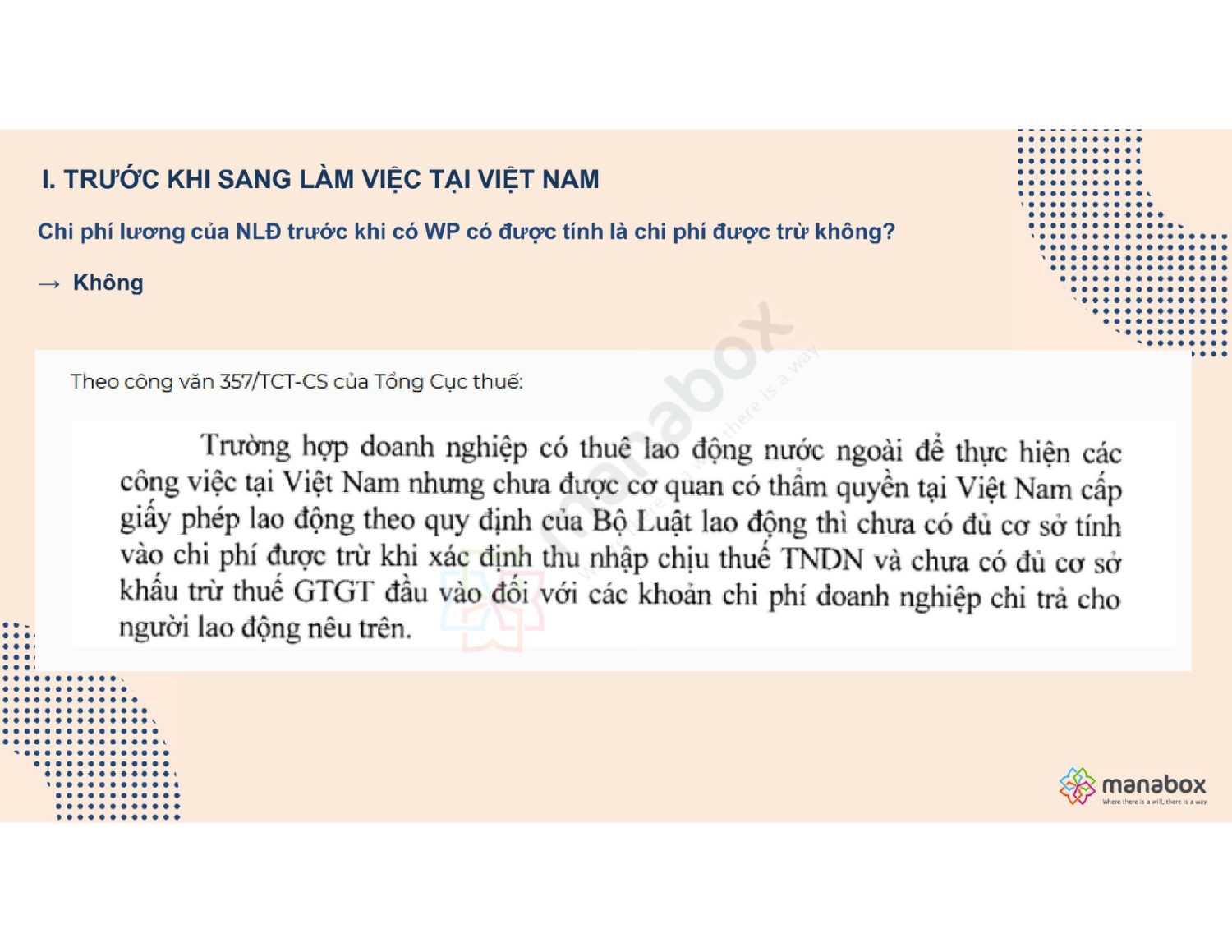 Các khoản chi phí trên thì đươc tính vào chi phí được trừ nếu có hồ sơ hợp lệ do gắn với công việc của người nước ngoài tại Việt Nam. Tuy nhiên, với vấn đề chi phí lương của NLĐ trước khi có giấy phép lao động – WP có được tính là chi phí được trừ không? Xem công văn 357/TCT-CS trả lời