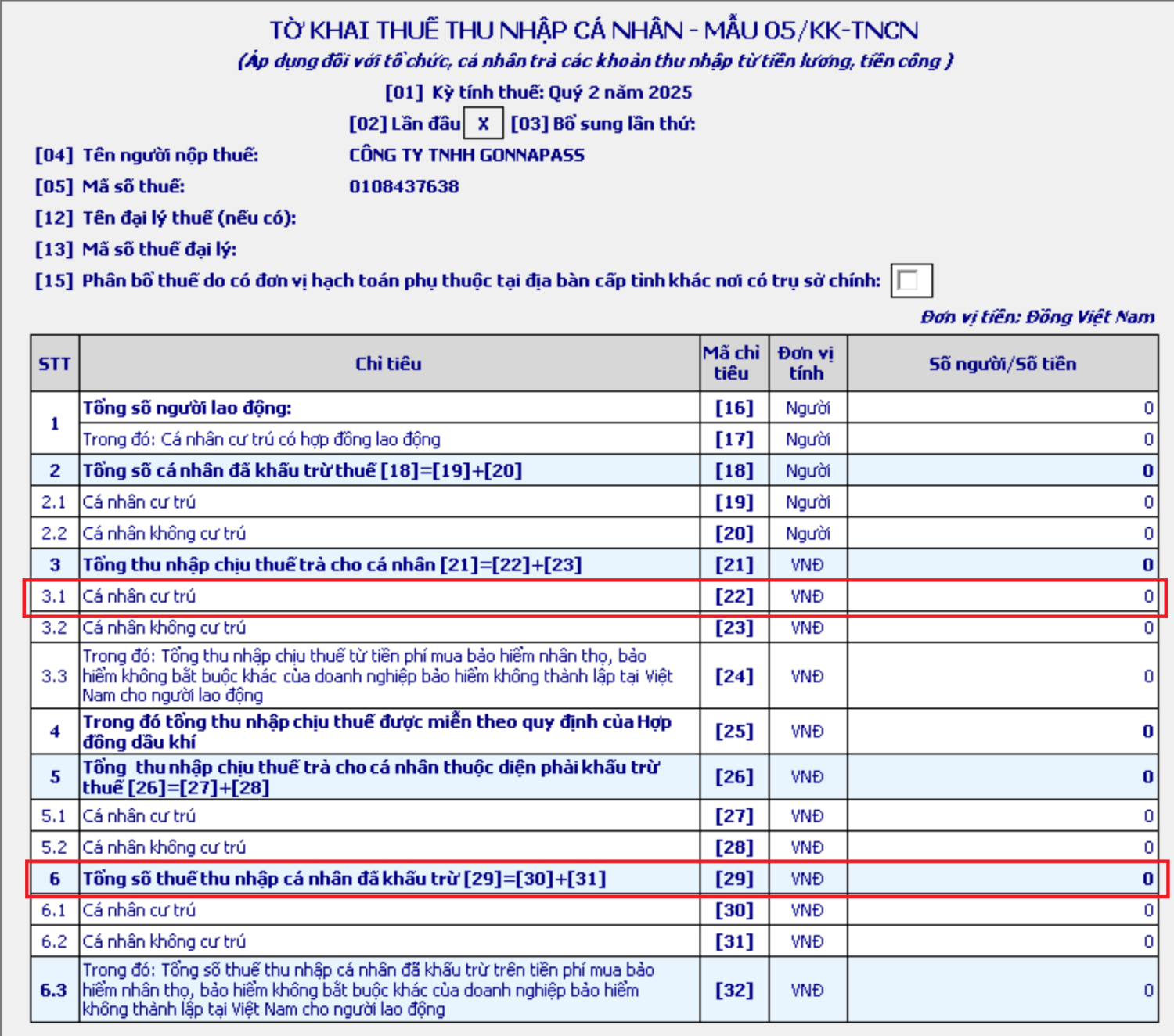 - Lưu ý kiểm tra chỉ tiêu [31] – Tổng số thuế đã khấu trừ trên tờ khai quyết toán thuế TNCN mẫu 05/QTT-TNCN: chỉ tiêu này phải tương ứng với Tổng số thuế đã khấu trừ (Chỉ tiêu [29] trên tờ khai 05/KK-TNCN tháng, quý).