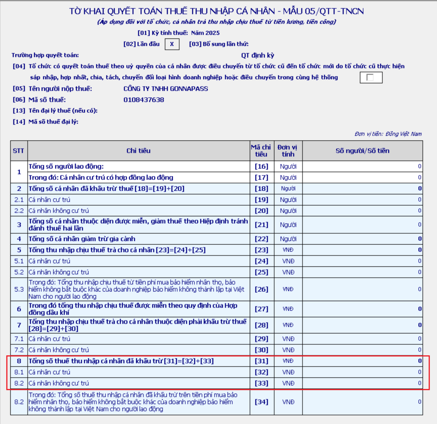 - Lưu ý kiểm tra chỉ tiêu [31] – Tổng số thuế đã khấu trừ trên tờ khai quyết toán thuế TNCN mẫu 05/QTT-TNCN: chỉ tiêu này phải tương ứng với Tổng số thuế đã khấu trừ (Chỉ tiêu [29] trên tờ khai 05/KK-TNCN tháng, quý).