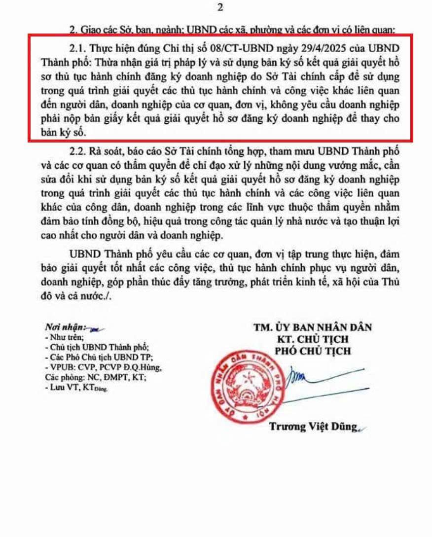 Triển khai ký số kết quả giải quyết hồ sơ đối với toàn bộ thủ tục hành chính trong lĩnh vực đăng ký doanh nghiệp trên địa bàn TP. Hà Nội, UBND TP. Hà Nội chính thức áp dụng chữ ký số trong giải quyết hồ sơ đăng ký doanh nghiệp từ 01/7/2025. Các cơ quan, đơn vị phải chấp nhận kết quả ký số thay cho bản giấy, chỉ cấp bản giấy khi có sự cố kỹ thuật hoặc có đề nghị chính đáng từ doanh nghiệp/tổ chức. Chủ trương này nhằm đơn giản hóa thủ tục hành chính, nâng cao hiệu quả phục vụ doanh nghiệp, thúc đẩy chuyển đổi số trong quản lý nhà nước.