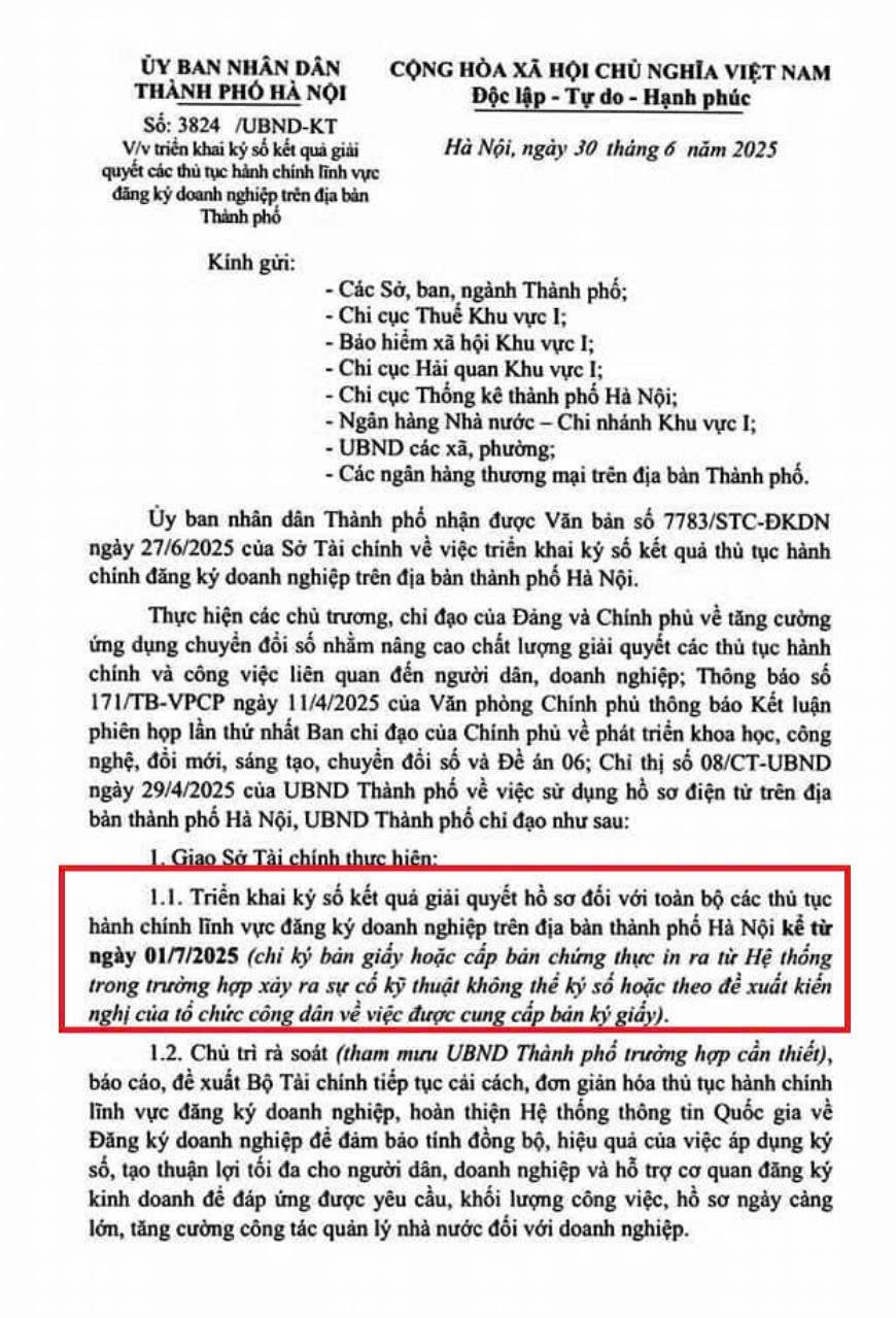 Triển khai ký số kết quả giải quyết hồ sơ đối với toàn bộ thủ tục hành chính trong lĩnh vực đăng ký doanh nghiệp trên địa bàn TP. Hà Nội, UBND TP. Hà Nội chính thức áp dụng chữ ký số trong giải quyết hồ sơ đăng ký doanh nghiệp từ 01/7/2025. Các cơ quan, đơn vị phải chấp nhận kết quả ký số thay cho bản giấy, chỉ cấp bản giấy khi có sự cố kỹ thuật hoặc có đề nghị chính đáng từ doanh nghiệp/tổ chức. Chủ trương này nhằm đơn giản hóa thủ tục hành chính, nâng cao hiệu quả phục vụ doanh nghiệp, thúc đẩy chuyển đổi số trong quản lý nhà nước.