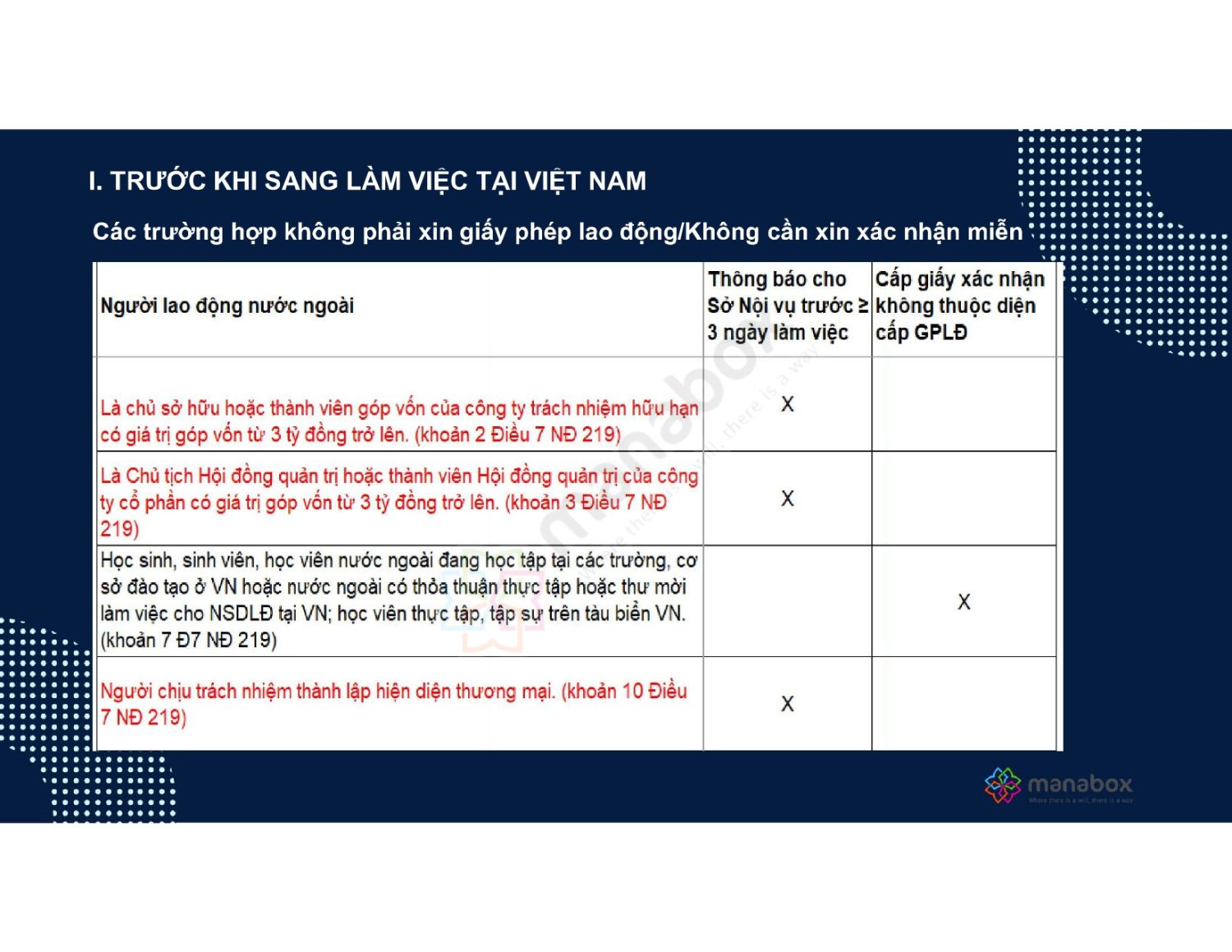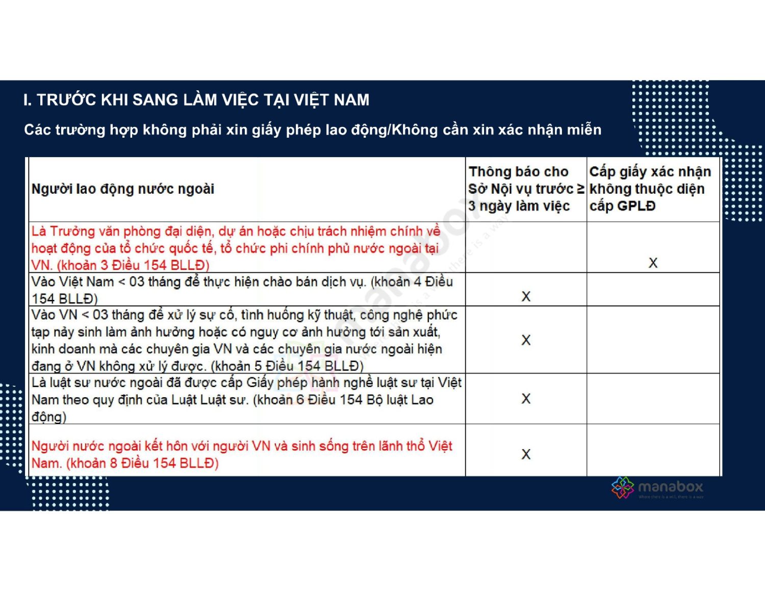 Dưới đây là bảng tóm tắt các trường hợp không phải xin giấy phép lao động (miễn giấy phép lao động – GPLĐ), chia thành 2 nhóm thủ tục: Nhóm phải xin “Xác nhận không thuộc diện cấp GPLĐ” và nhóm chỉ “Thông báo” (không cần xin xác nhận).
