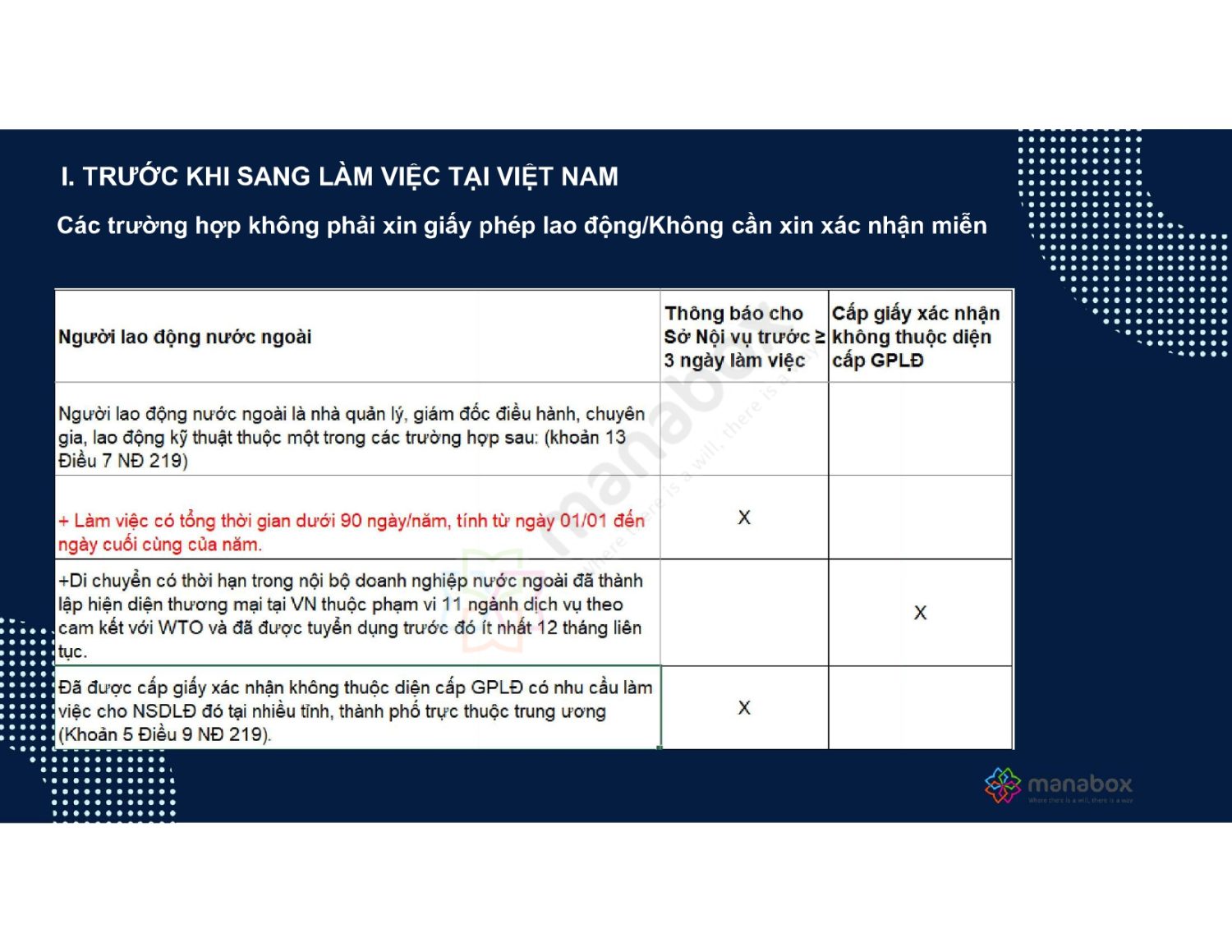 Làm việc ngắn hạn dưới 30 ngày: Nếu tổng thời gian có mặt làm việc tại Việt Nam dưới 90 ngày trong 1 năm thì chỉ cần thông báo với cơ quan chức năng, không cần xin giấy phép. Ví dụ, chuyên gia sang hỗ trợ kỹ thuật 2 tuần sẽ thuộc diện này.