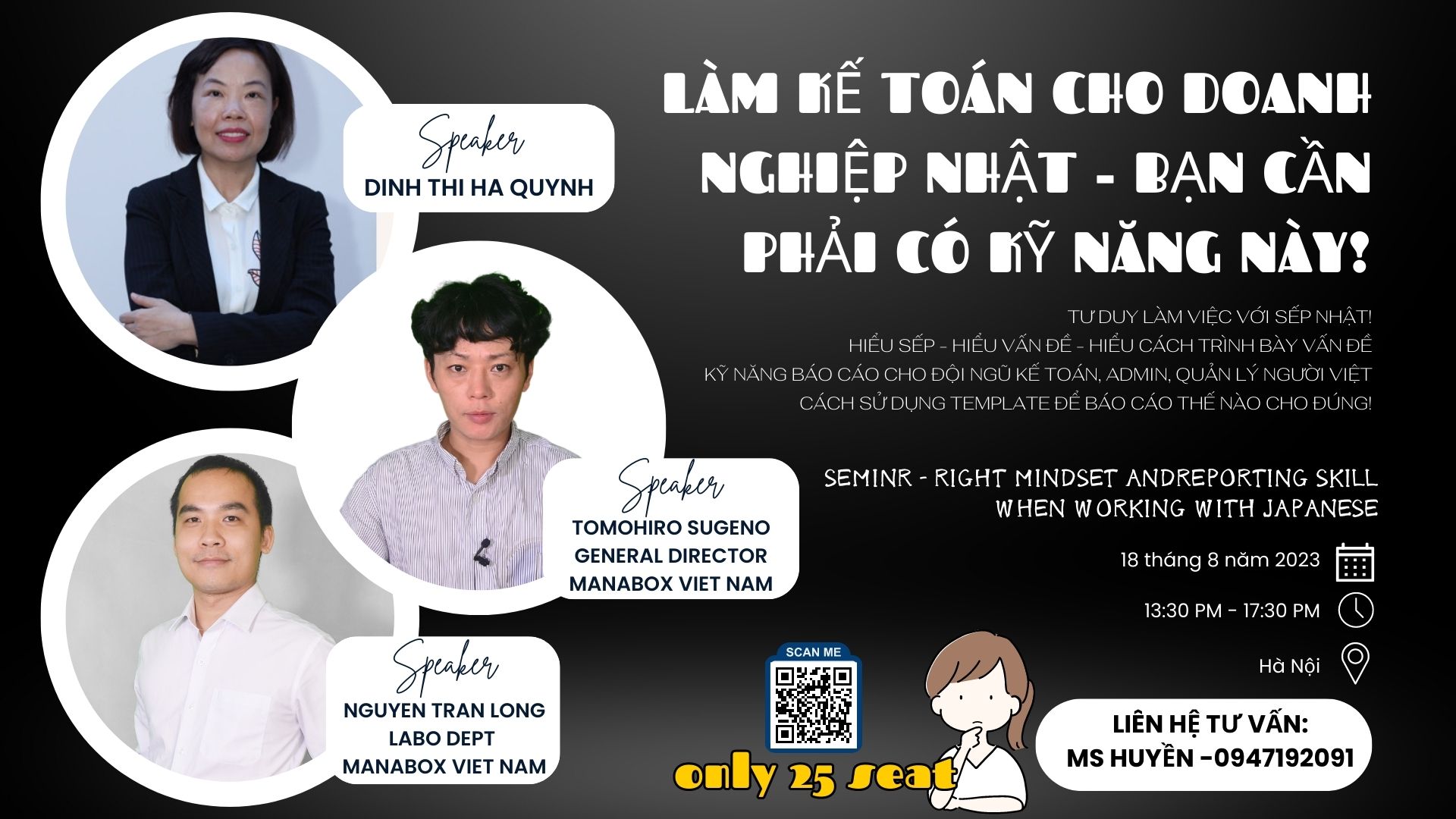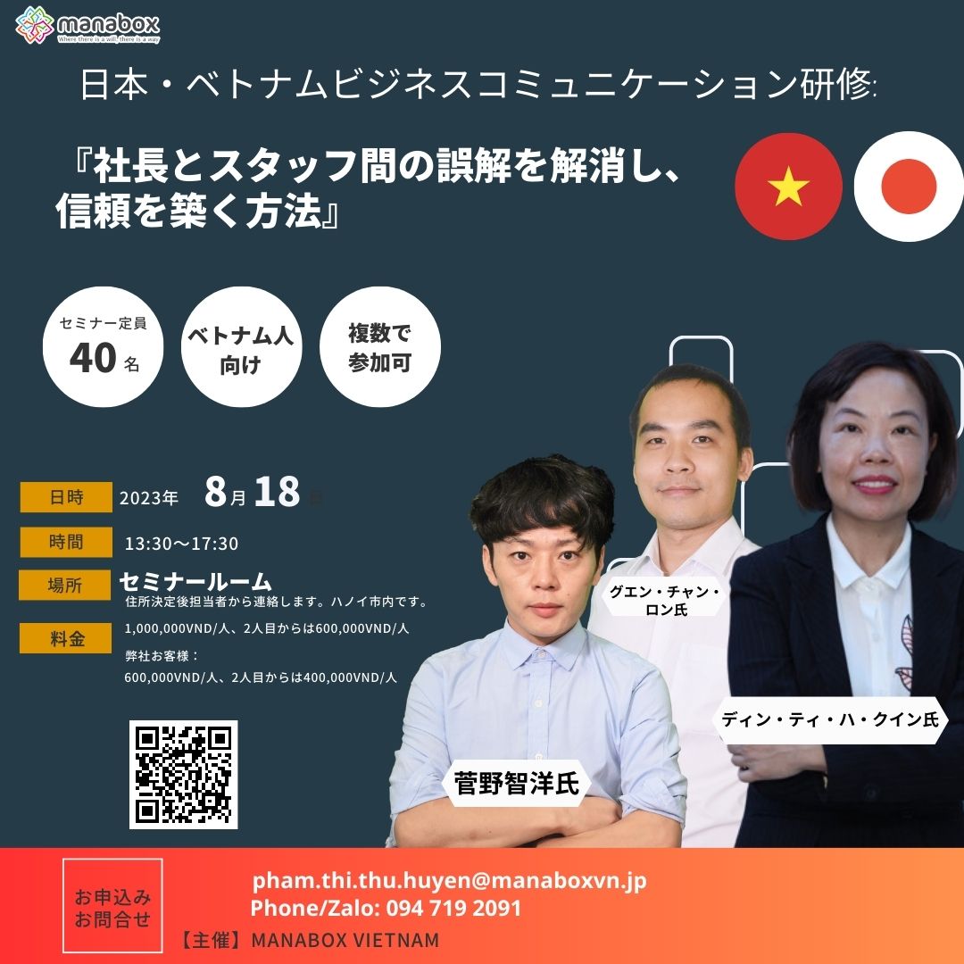 Manabox trân trọng cảm ơn quý khách đã tham dự Webinar ”Tư duy làm việc và kỹ năng báo cáo cho sếp Nhật” do diễn giả Dinh Thi Ha Quynh, Tổng giám đốc Manabox Việt Nam – Tomohiro Sugeno và diễn giả Nguyễn Trần Long – Labo Dept dẫn dắt. Chúng tôi mong rằng, hội thảo đã mang đến cho quý vị nhiều thông tin giá trị, hữu ích và có giá trị thực tiễn cao để vận dụng trong công việc.