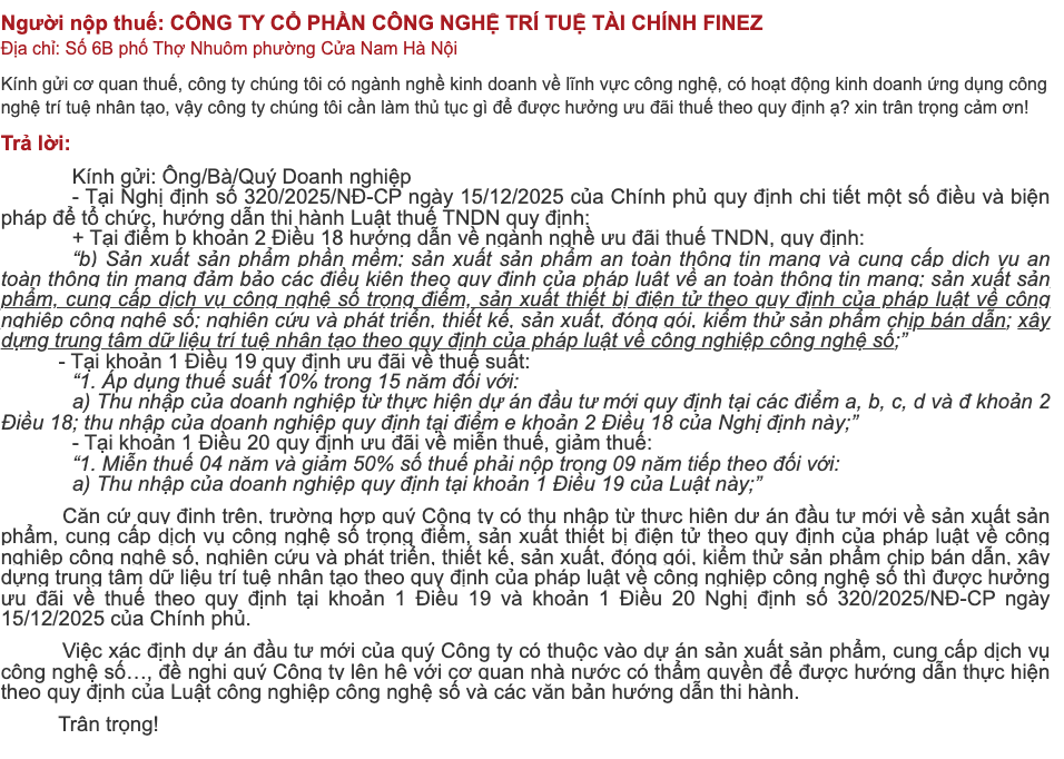 Năm 2026 đánh dấu bước ngoặt lớn cho các doanh nghiệp công nghệ tại Việt Nam khi Chính phủ ban hành Nghị định 320/2025/NĐ-CP với những ưu đãi thuế chưa từng có. Nếu doanh nghiệp của bạn đang hoạt động trong lĩnh vực Trí tuệ nhân tạo (AI) như FINEZ, đây là những con số bạn không thể bỏ qua.