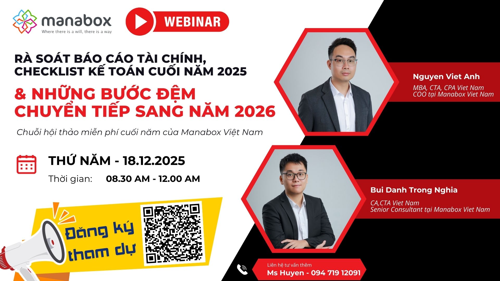 Hiểu được điều này, Manabox tổ chức Hội thảo cuối năm 2025 với mục tiêu không chỉ giúp kế toán/doanh nghiệp: Hoàn thành công việc cuối năm đúng – đủ – an toàn mà còn giúp anh/chị xây dựng bước đệm chuẩn bị cho năm 2026, đảm bảo thích ứng kịp thời khi Thông tư 99 chính thức áp dụng.