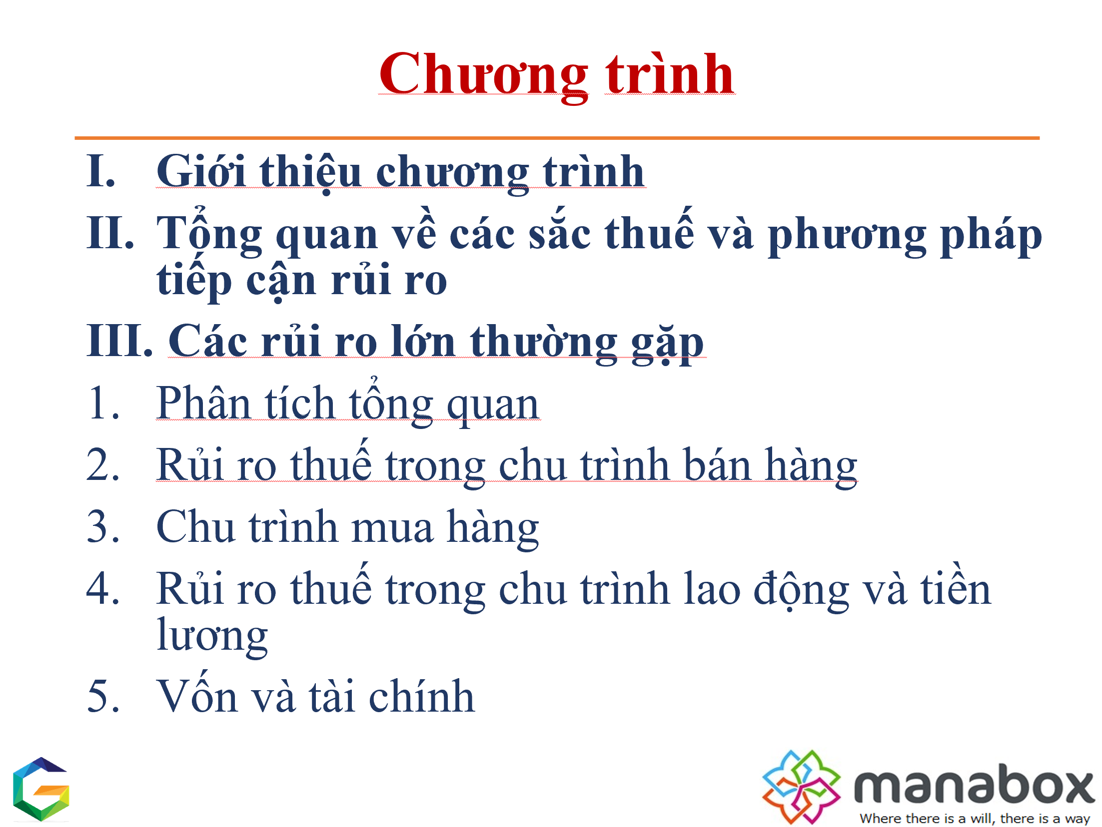 Các vấn đề bị chỉ ra và truy thu thuế gần đây có xu hướng chuyển dần sang các vấn đề chuyên sâu và xét theo bản chất thay vì hình thức như giai đoạn trước. Các khoản mục này có ảnh hưởng lớn nhưng việc giải trình lại phức tạp hơn, ví dụ như các khoản chi phí nhãn hiệu, phí quản lý từ công ty mẹ, tình trạng lỗ liên tục…. Việc giải trình sẽ càng khó khăn khi công ty mẹ và ban giám đốc không có cùng tần số về kiểm soát và hạn chế rủi ro thuế với kế toán để thống nhất hành động trong doanh nghiệp. Hội thảo “Xây dựng kế hoạch kiểm soát rủi ro Thuế” với sự dẫn dắt của diễn giả – Nguyễn Thị Loan ( CMA Aus, CTA, CPA Việt Nam ) – Giám đốc tư vấn tại Manabox Việt Nam sẽ mang đến những thông tin quản lý rủi ro thiết thực nhất cho các công ty.