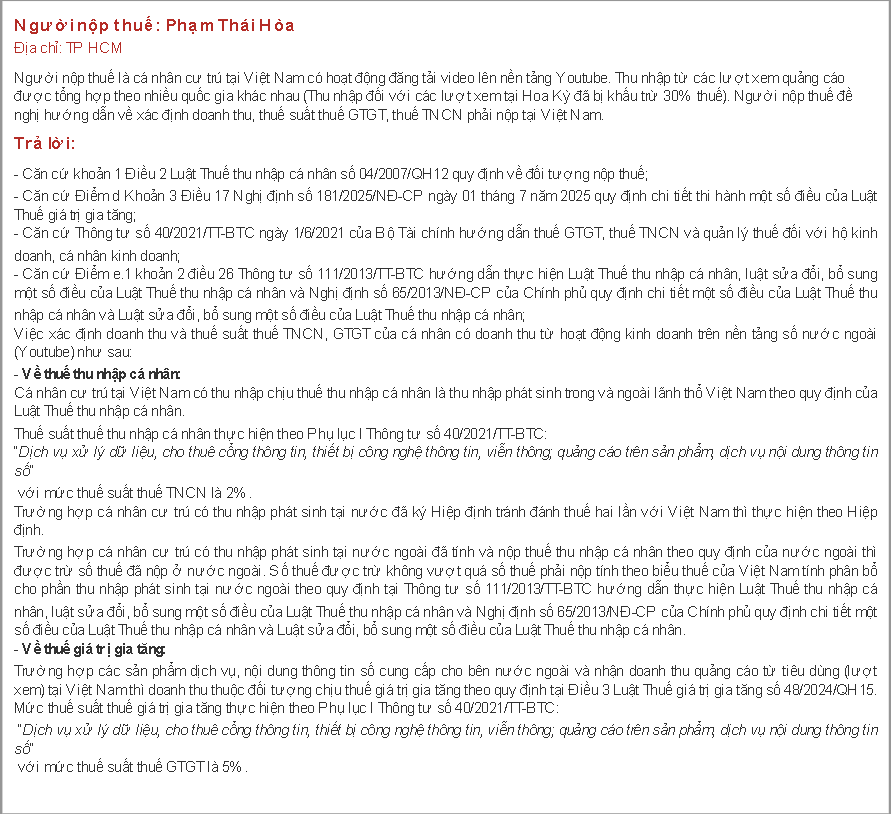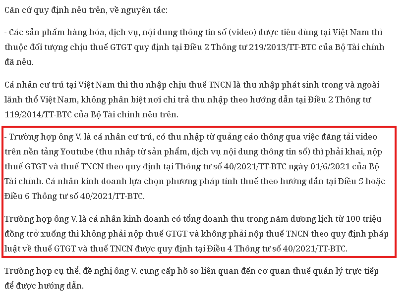 - Nếu >500 triệu thì kê khai theo diện cá nhân kinh doanh/doanh thu dịch vụ → thường áp dụng: 5% thuế TNCN + 2% thuế GTGT trên doanh thu (~ 7%) (Từ năm 2026, tỷ lệ 5% thuế TNCN, 5% thuế GTGT)
