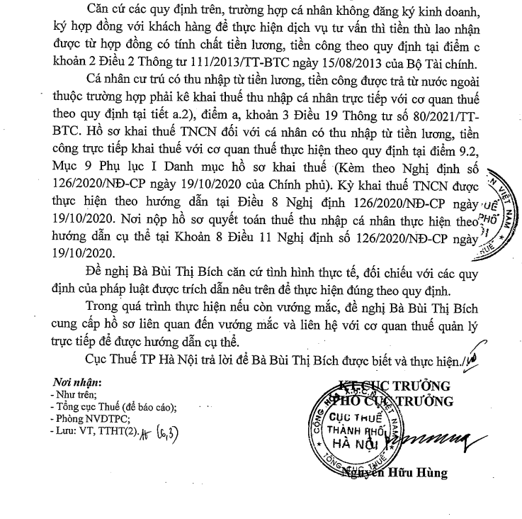 Trích hướng dẫn tại công văn 56955/CTHN-TTHT V/v thực hiện nghĩa vụ thuế đối với thu nhập từ nước ngoài Trả lời đơn đề nghị giải đáp của Bà Bùi Thị Bích về thực hiện nghĩa vụ thuế đối với thu nhập từ nước ngoài theo Phiếu chuyển số 777/PC-TCT ngày 12/7/2023 của Tổng cục Thuế, Cục Thuế TP Hà Nội có ý kiến như sau: …Căn cứ các quy định trên, trường hợp cá nhân không đăng ký kinh doanh, ký hợp đồng với khách hàng để thực hiện dịch vụ tư vấn thì tiền thù lao nhận được từ hợp đồng có tính chất tiền lương, tiền công theo quy định tại điểm c khoản 2 Điều 2 Thông tư 111/2013/TT-BTC ngày 15/08/2013 của Bộ Tài chính. Cá nhân cư trú có thu nhập từ tiền lương, tiền công được trả từ nước ngoài thuộc trường hợp phải kê khai thuế thu nhập cá nhân trực tiếp với cơ quan thuế theo quy định tại tiết a.2), điểm a, khoản 3 Điều 19 Thông tư số 80/2021/TT-BTC.