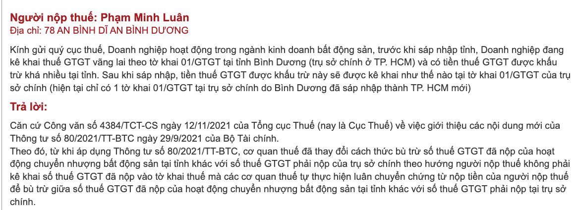 Khi các đơn vị hành chính sáp nhập (ví dụ điển hình là Bình Dương sáp nhập vào TP.HCM), các doanh nghiệp bất động sản có hoạt động vãng lai tại địa phương thường lo lắng về việc thất thoát hoặc khó khăn trong việc thu hồi số thuế GTGT đã nộp hoặc được khấu trừ. Tuy nhiên, quy định hiện hành đã có cơ chế xử lý tự động rất thông minh.