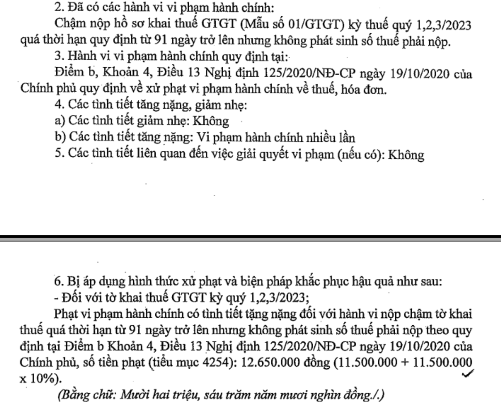 Trích biên bản xử phạt chậm nộp nhiều tờ khai thuế